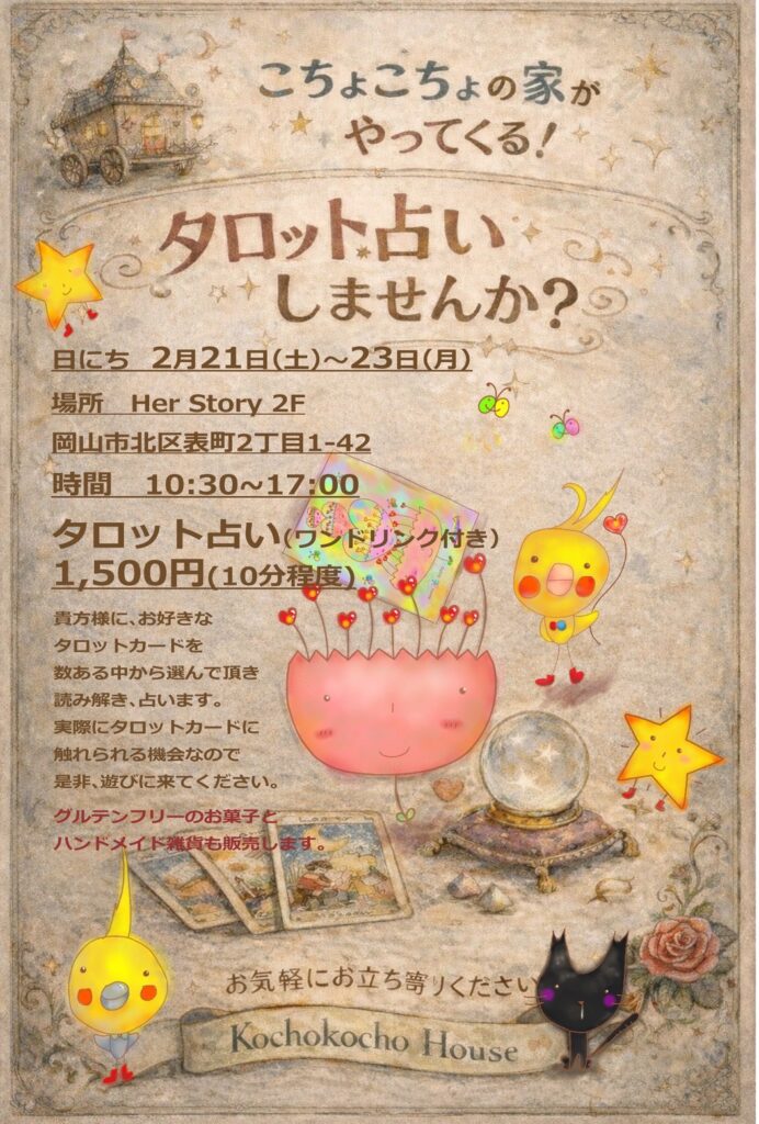 イベント情報 岡山【出張タロットリーディング】のお知らせ 2026年1月16日 こんにちはこちょこちょのキョウコです。 ⭐️2月21日(土)〜23日(月)の3日間娘が手がけたオモテマチブックスクエアHer Story 2F にて✨出張タロットリーディング✨をさせていただきます。素敵なカフェ空間でカードとあなたの感覚が静かに重なる場所。 たくさんのカードの中からお好きなカードを選んでみてね☆ 「気になる」「かわいい」そんな理由で選んでも今のあなたにちょうどいいメッセージをカード達はちゃんと運んでくれます🕊選んだカードからのメッセージをやさしく読み解いてお伝えします。鑑定後はカードの余韻を感じながらお好きなドリンクとともにゆっくりお過ごしください☕️ゆっくりと自分と向き合うひとときとして受け取っていただけたら嬉しいです。☕ Her Story 2F🕰 10:30〜17:00💫 タロットリーディング (ワンドリンク付き)1,500円/約10分程度「なんとなく気になる」その感覚のままでどうぞお越しください🌿ご予約なしでふらっとお立ち寄り下さい⭐️☆こちょこちょのイベント情報☆ 前 2026年1月新月リーディングのご案内